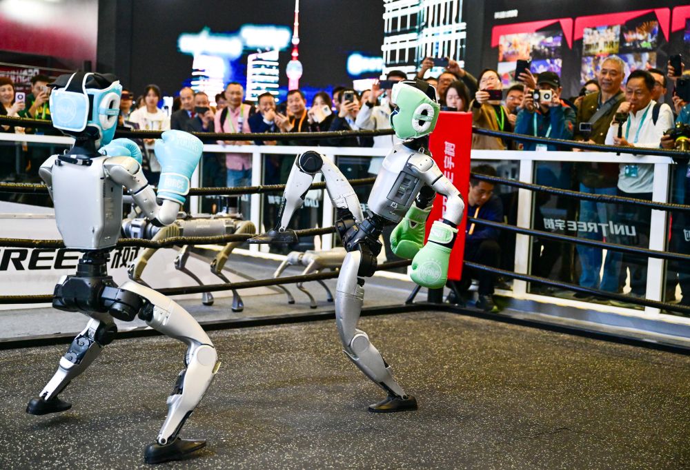 2025年11月6日,人形机器人在第八届进博会宇树科技展台进行格斗表演。当日,在技术装备展区宇树科技展台,两台G1人形机器人的格斗表演吸引了众多观众。它们戴着护具及拳套,施展直拳、勾拳、左右鞭腿,展示倒地自主起身等复杂动作,不时赢得观众喝彩。