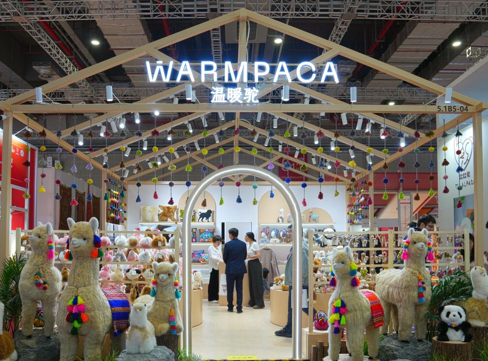 2025年11月5日在第八届进博会消费品展区拍摄的“温暖驼”展台。从秘鲁阿雷基帕的小店,到进博会的展台,再到全球消费者手中,进博会为“温暖驼”带来了巨大的发展机遇。本届进博会,“温暖驼”展位面积已从2018年首届进博会的9平方米拓展至54平方米,并在上海、厦门等地开设6家门店。源自进博会的“温暖驼”订单不仅助力秘鲁200多个家庭脱贫,还倒逼一场“品质革命”,让羊驼玩偶制作对标世界标准。